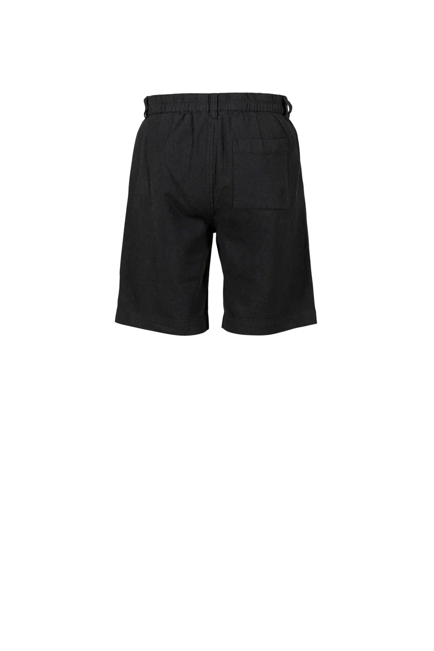 55% lin, 45% bomull. Knapp og glidelås i gylf.