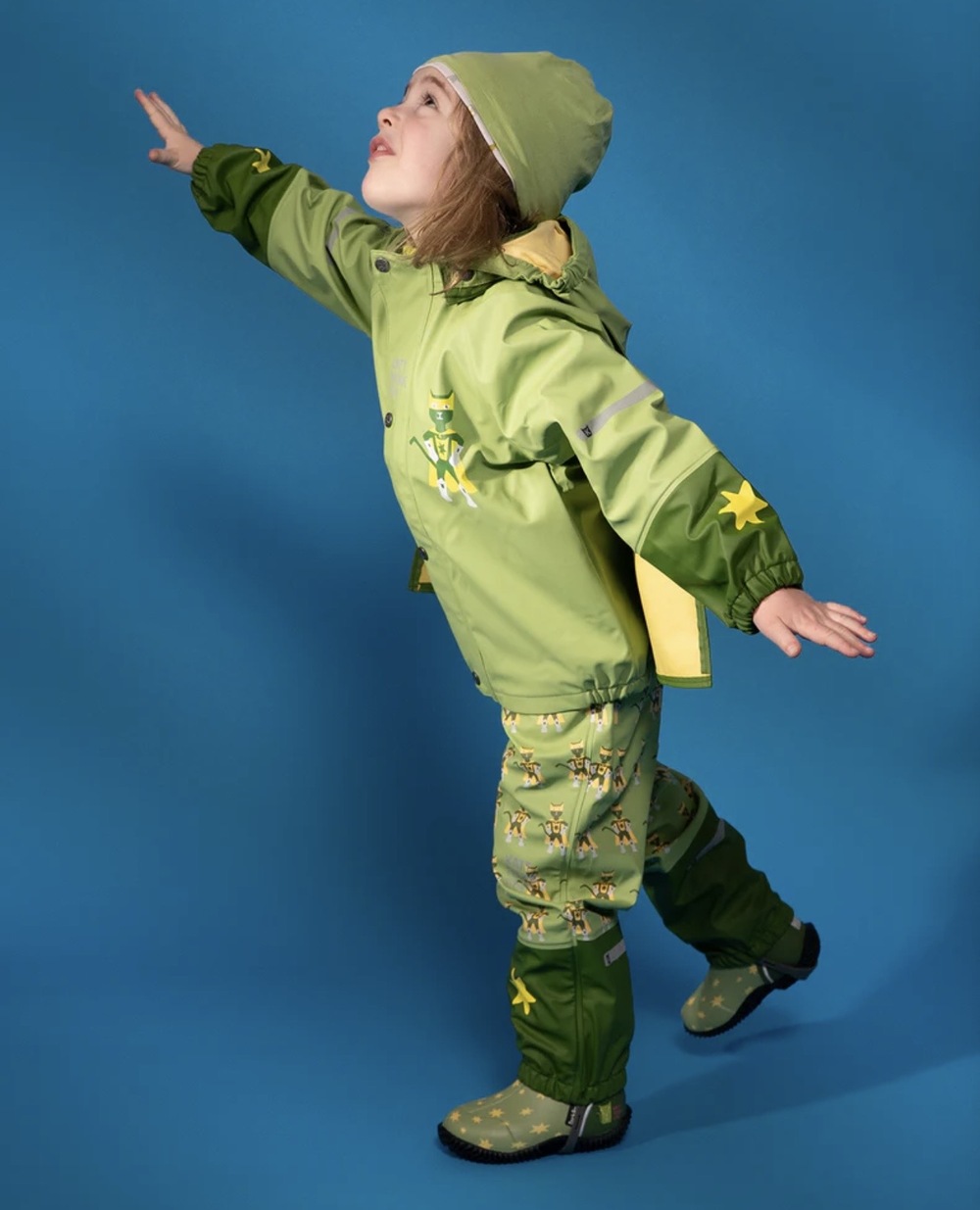 Her er både jakke og bukse i same gode PU kvalitet, med børsta innside. Det er mjuk fleece på insida av kragen og vannstopper finst i både ermer og bein. Her har me slitesterk gummistrikk under føtene, refleksar på jakke og bukse, og mykje moro i print og andre detaljar. Sveisa saumar og sikker hette som er både avtagbar og regulerbar. Regnsettet er romsleg i storleik - Vel den storleiken som er nærast barnets høgd i centimeter.