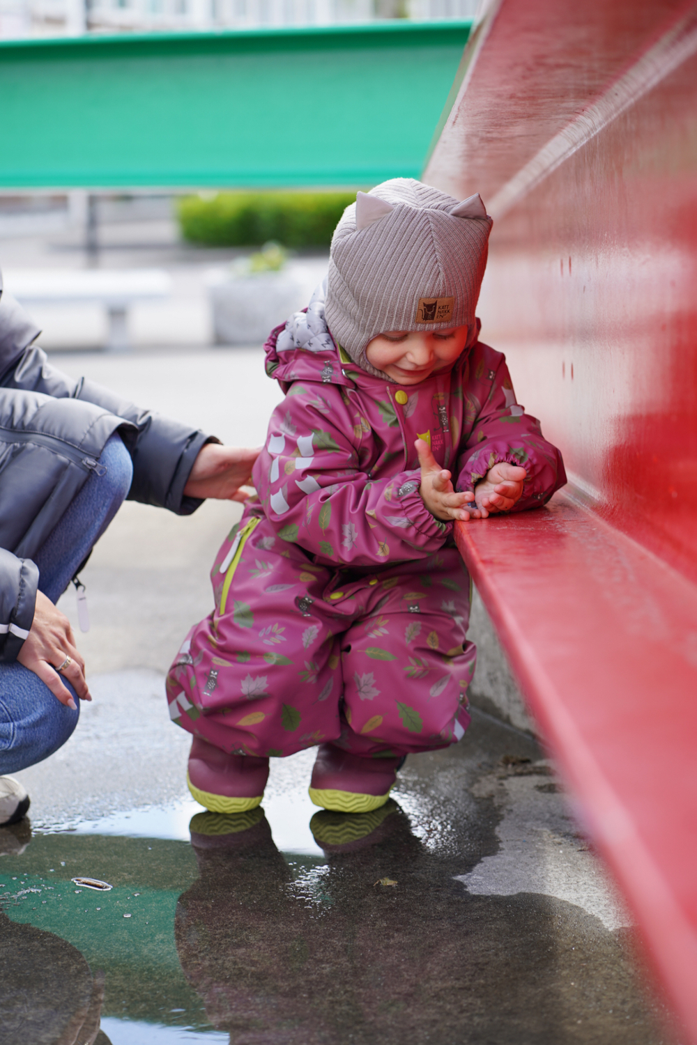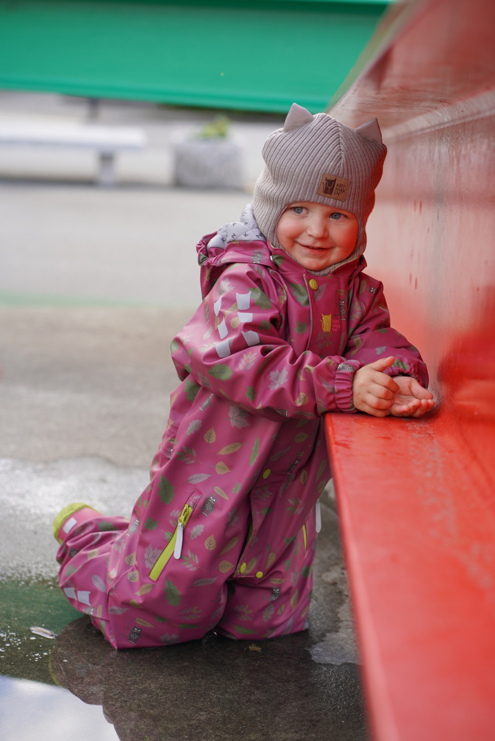 Dressen er god i størrelsen så mål barnet si høgde og velg den størrelsen som ligg nærast! Det er ikkje behageleg for barnet å bruke for store klede. Då mistar dei sin bevegelsesfrihet når dei er ute og leikar, og plagget blir utsatt for unødvendig slitasje. Dressen tørkar fort om ein vrenger den etter vask og heng den opp etter fotstrikkane.