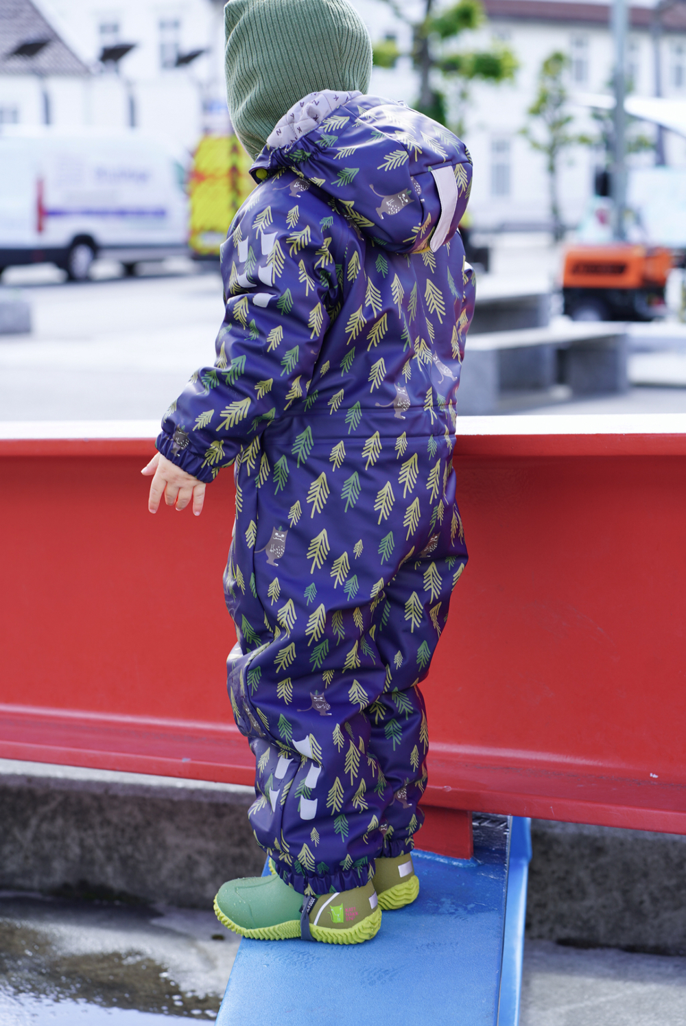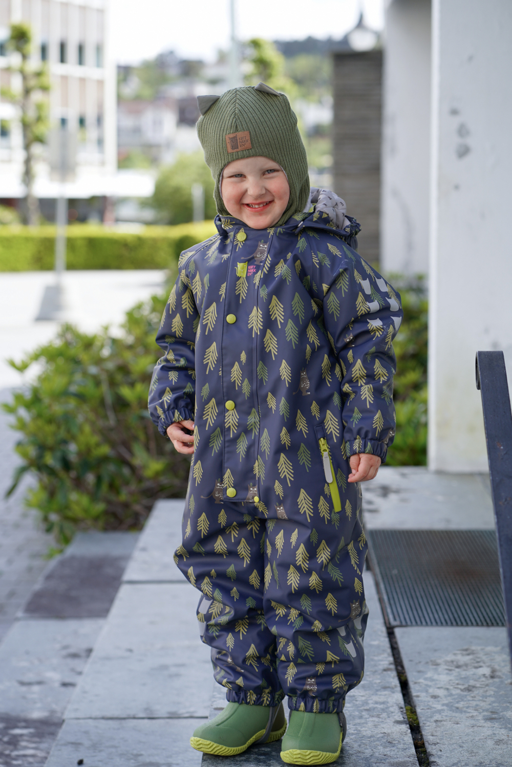 Dressen er god i størrelsen så mål barnet si høgde og velg den størrelsen som ligg nærast! Det er ikkje behageleg for barnet å bruke for store klede. Då mistar dei sin bevegelsesfrihet når dei er ute og leikar, og plagget blir utsatt for unødvendig slitasje. Dressen tørkar fort om ein vrenger den etter vask og heng den opp etter fotstrikkane.