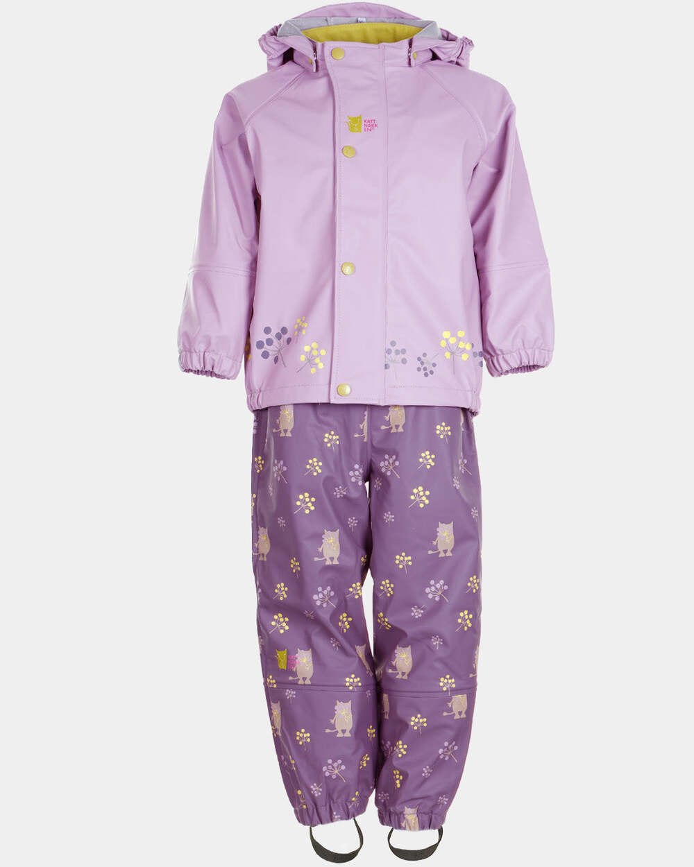 Kattnakken Plask! Her er både jakke og bukse i same gode PU kvalitet, med børsta innside. Det er mjuk fleece på insida av kragen og vannstopper finst i både ermer og bein. Her er det slitesterk gummistrikk under føtene, refleksar på jakke og bukse, og mykje moro i print og andre detaljar. Sveisa saumar og sikker hette som er både avtagbar og regulerbar.