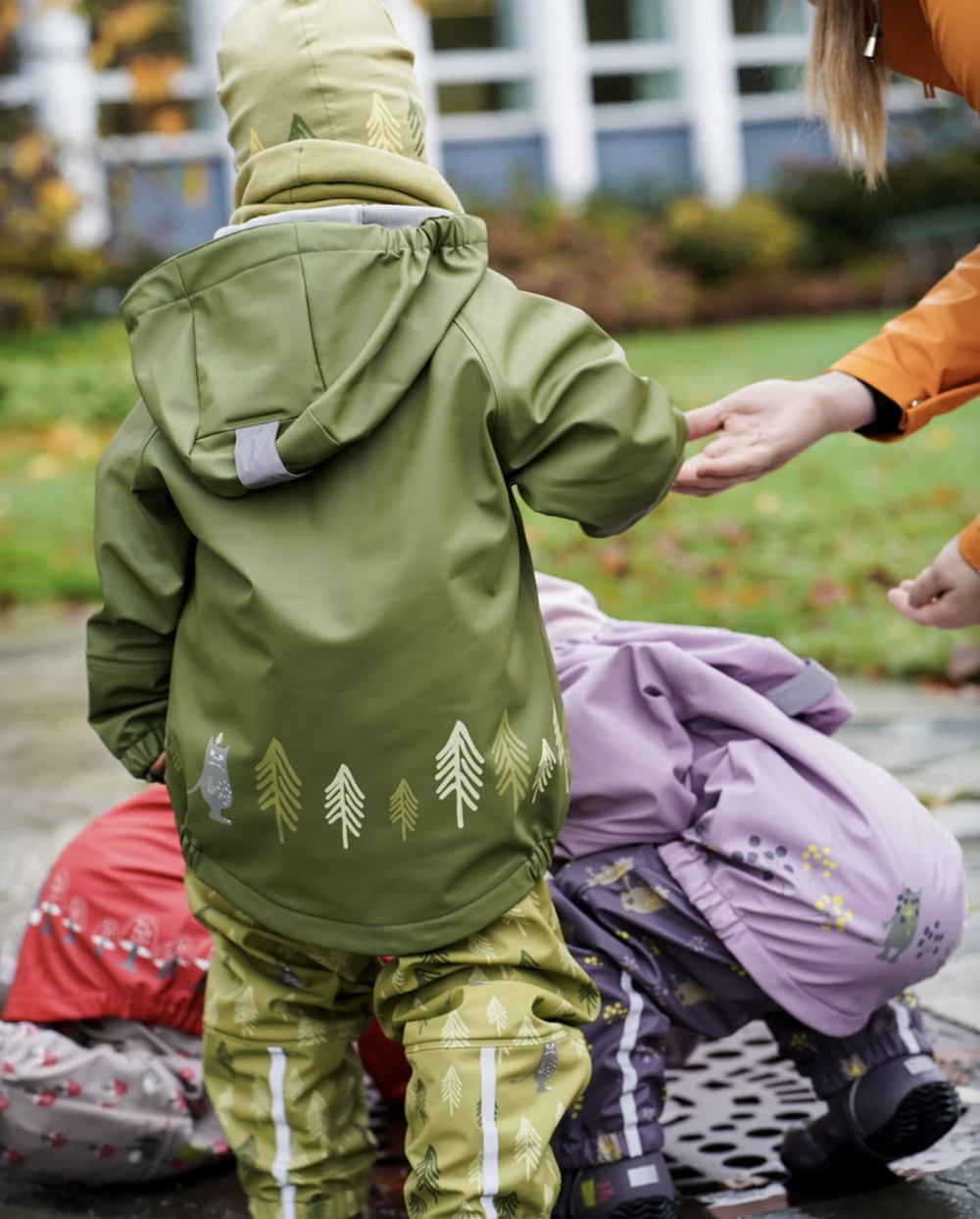 Kattnakken Plask! Her er både jakke og bukse i same gode PU kvalitet, med børsta innside. Det er mjuk fleece på insida av kragen og vannstopper finst i både ermer og bein. Her er det slitesterk gummistrikk under føtene, refleksar på jakke og bukse, og mykje moro i print og andre detaljar. Sveisa saumar og sikker hette som er både avtagbar og regulerbar.