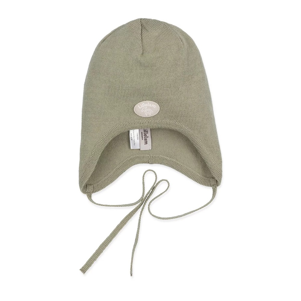 Lillelams klassiske babylue i tynn ull, med knyting og fine detaljer.