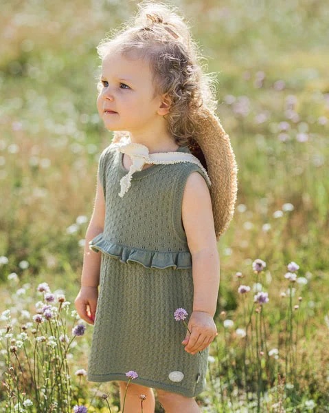 En skjønn sommerkjole med fine detaljer til de minste. Kjolen har et delikat hullmønster som gjør plagget ekstra lett og luftig. Perfekt for en sommerdag - da merinoull også beskytter mot UV-stråling og hjelper deg med å regulere kroppstemperaturen. Med den dekorative volangen under brystet, er kjolen også fin til pyntede anledninger. Bruk den alene rett på huden, eller med en body og strømpebukser under på kaldere dager.