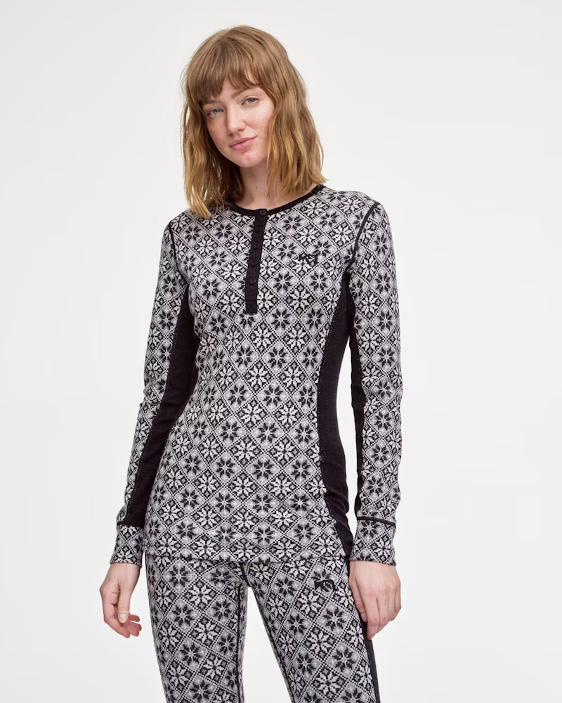 Kari Traa Rose Langermet Ulltrøye er en baselayer overdel i 100% merinoull. Ullundertøyet har det klassiske rosedesignet fra KT og en kroppsnær, sporty silhuett. Bærekraftig høstet ull og 4-veis stretch gjør dette mellomtunge plagget berøringsmykt, lukthemmende og pustende. Knappene i halsen gjør det lett å regulere temperaturen. Rund hals og raglanermer gjør lagvis påkledning en lek.
