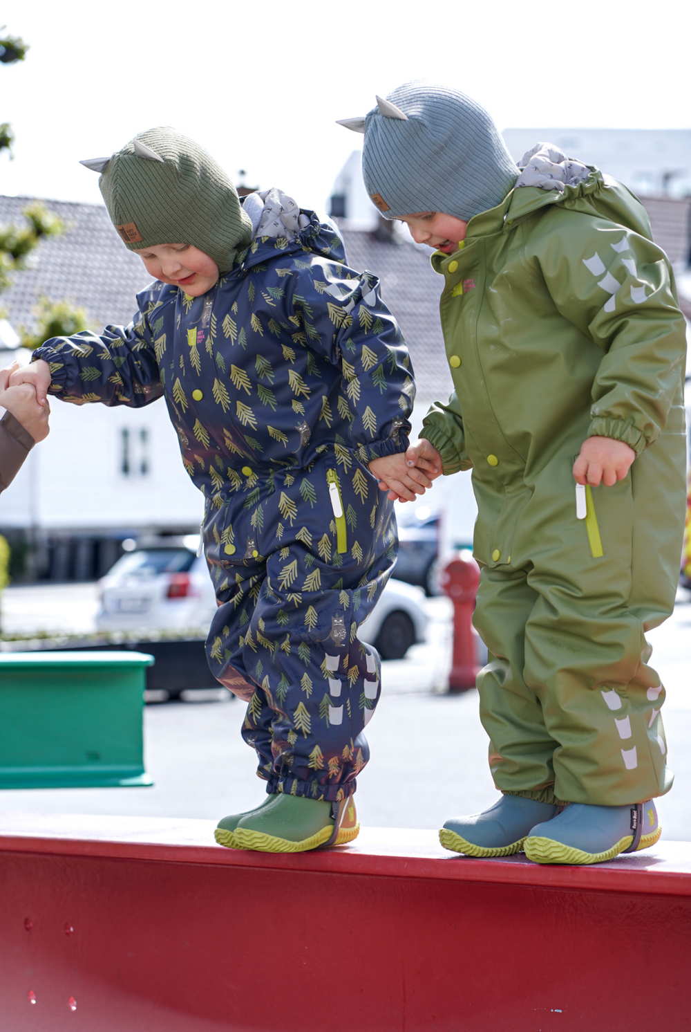 Dressen er god i størrelsen så mål barnet si høgde og velg den størrelsen som ligg nærast! Det er ikkje behageleg for barnet å bruke for store klede. Då mistar dei sin bevegelsesfrihet når dei er ute og leikar, og plagget blir utsatt for unødvendig slitasje. Dressen tørkar fort om ein vrenger den etter vask og heng den opp etter fotstrikkane.