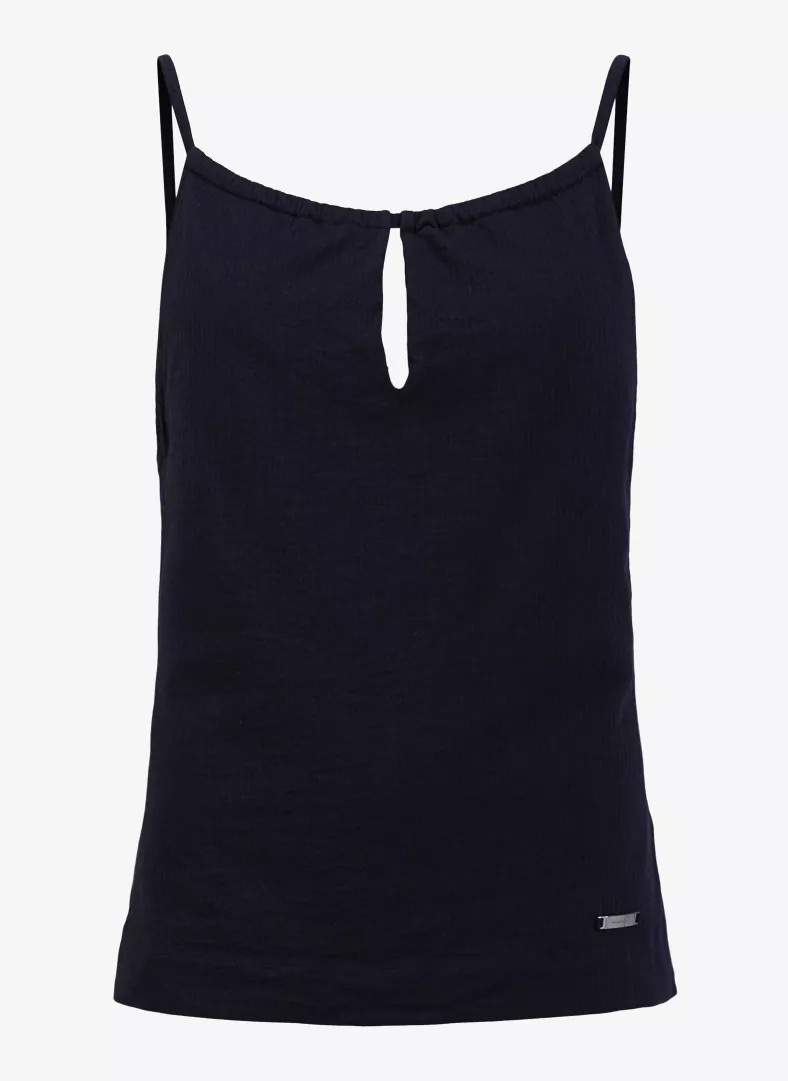 Et naturlig valg for varme sommerdager ved sjøen. Den flytende jacquardstrikkede blandingen av elastan og bomull gir en myk og lett følelse mot huden din. Med en fôret øvre del og justerbare skulderstropper, sikrer den komfort for alle kroppstyper. Den rynkede detaljen med splitt i halsen og et tverrbakdesign gir denne toppen en usedvanlig flatterende fasong. Enten den er gjemt inn i W Dock Skort for en figurnær passform eller bæres uopptrukket for en grasiøs silhuett i A-linje, eller sammen med kontrasterende shorts, tilbyr den allsidige og elegante stylingsalternativer.